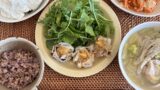 左からいつもの焼き芋に🍠高タンパクヨーグルトをかけたもの、ミニトマト、長葱・キムチ・海苔卵黄を乗せた納豆、鶏手羽先と大根の煮物、スーパー大麦入り玄米雑穀ご飯、玉葱とワカメの手羽先スープ、以上です。