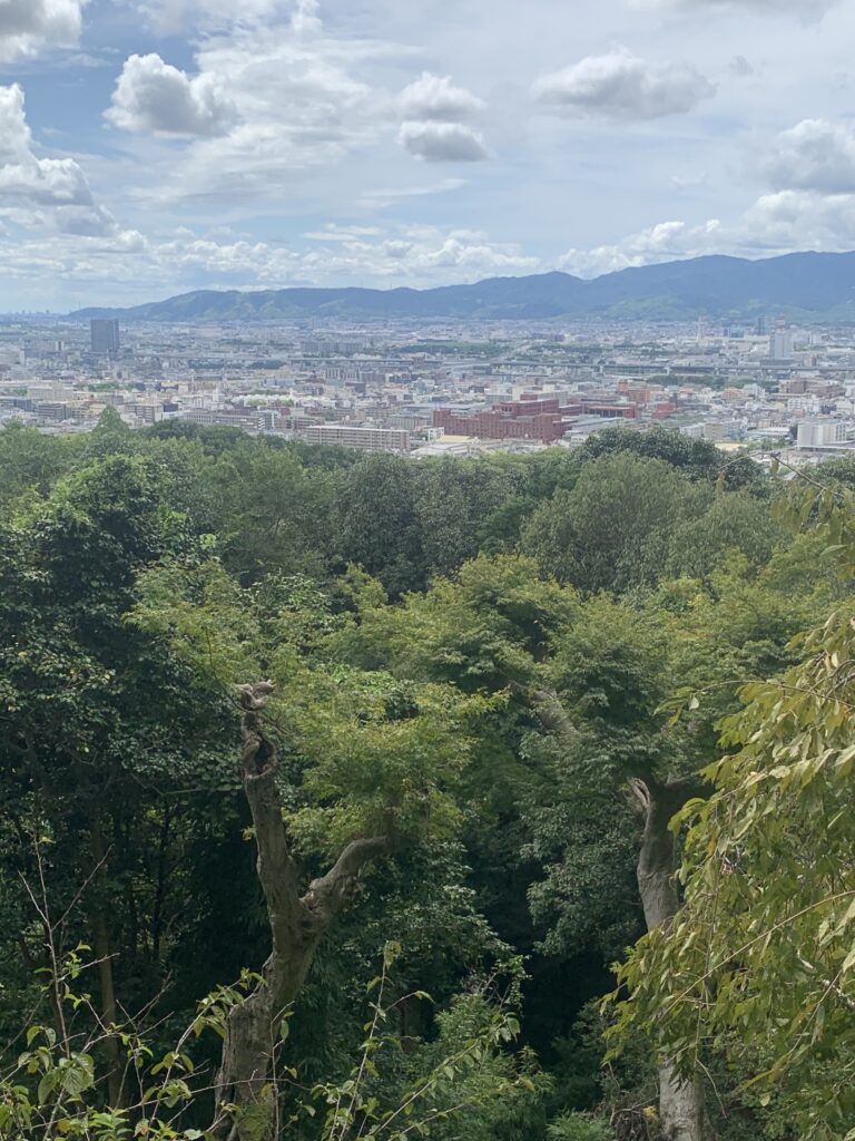 稲荷山を巡る幾つかのコースの説明板があり、木々の間からは京都市内を望めることが出来ました。ここまででも結構疲れたというのに、この先稲荷山を1周して本殿に降りるには2時間近い行程だというではありませんか…💦