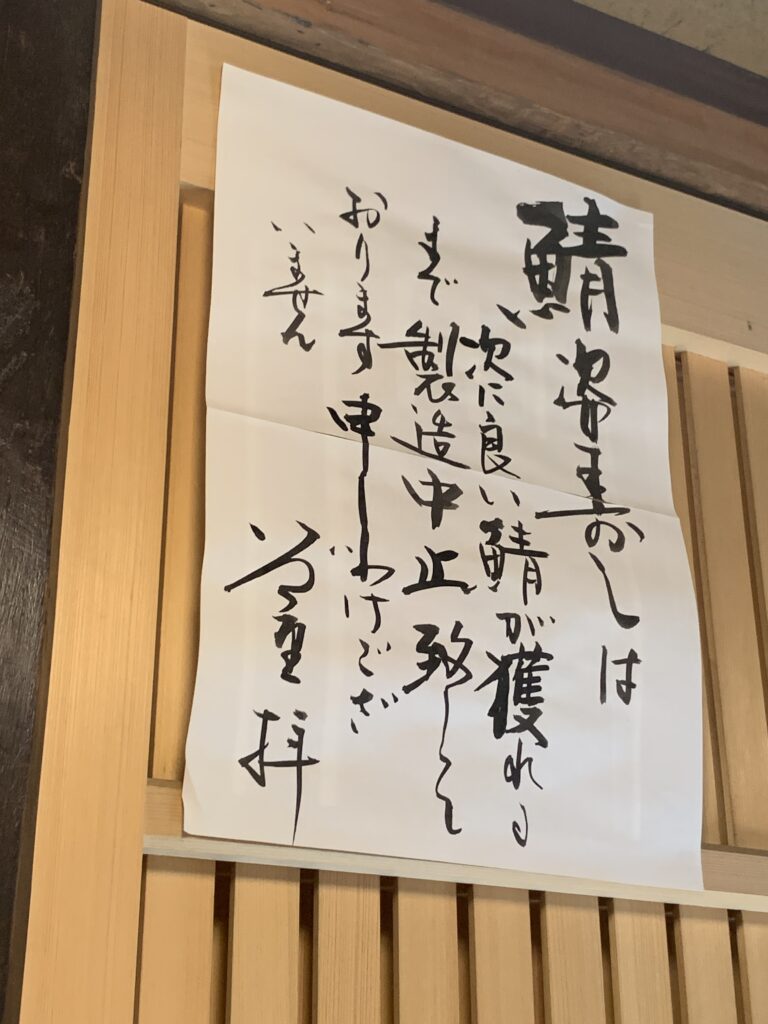 箱寿司をお土産にしたので、鯖の棒鮨を食べようと思っていたのですが、上質の鯖が入荷するまでは鯖姿寿しはお休みと書かれています。あら〜💦