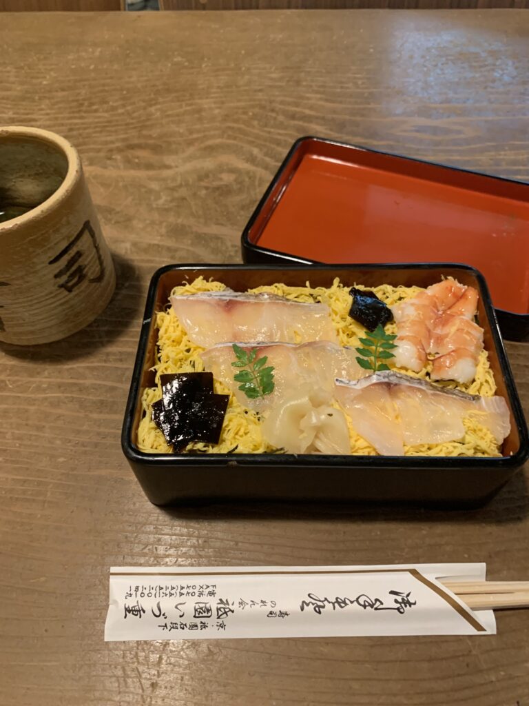 上品な酢締めの鯛と海老、昆布の佃煮と木の芽が、ふわふわに敷き詰められた錦糸卵の上に乗っています。酢飯には細かく刻まれた焼き鱧が混ぜられていて本当に良いお味…😋