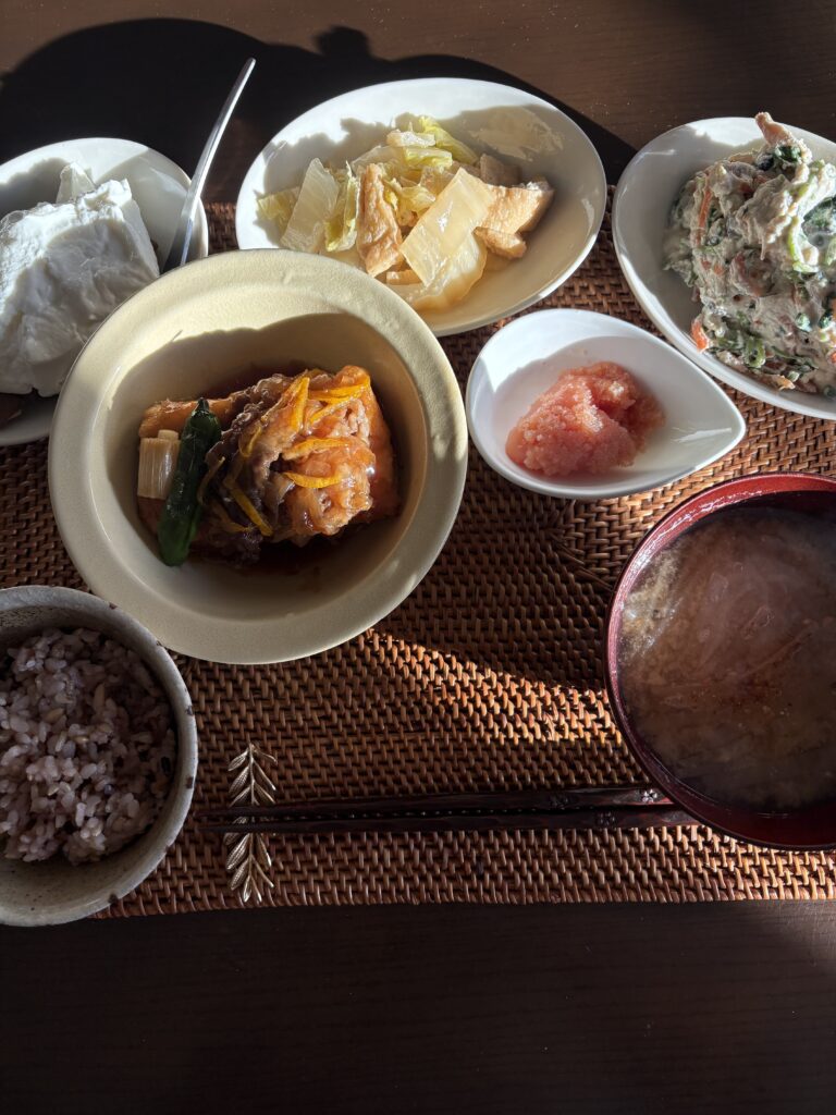 白和えに肉豆腐、白菜と揚げの煮物、明太子に大根のお味噌汁といった定番のメニューです。