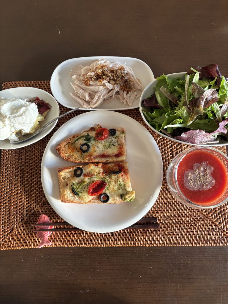 いつもの焼き芋ヨーグルトに、BIO-RALオリジナルの「鶏肉と塩だけで作ったサラダチキン」にマスタードソースをかけたもの、レタスのみのベビーリーフとトマトジュースには身体を温めるヒハツを振りました。