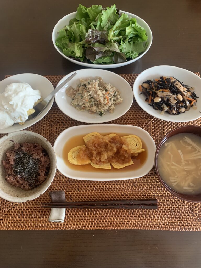 左からいつもの焼き芋に🍠高タンパクヨーグルトをかけたもの、卯の花、ひじきの煮物、ベビーリーフにリンゴ酢とオリーブオイルをかけたサラダ、ちりめん山椒をかけた玄米雑穀ご飯、ビオラルのだし巻き玉子、えのき茸の味噌汁、以上です。以前はこんなおかずではご飯が食べられなかったものですが、今はこういうおかずが美味しいと思えるようになりました。年をとったってことかなぁ😅
