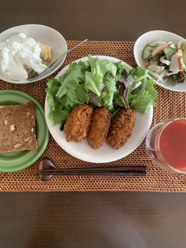 なんだかんだ言いながら、あっという間に金曜日です。この日は、前日の仕事帰りにデパ地下の「まつおか」で買ったカキフライを温め直して食べました。終わり間際だったので3パック1000円で大粒のカキフライときゅうりの甘酢和えを中心に、金曜の朝はパンの朝ご飯でした。