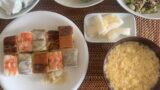 左からいつもの焼き芋🍠、千枚漬け、おでん(大根、人参、里芋、こんにゃく、竹輪、ゆで卵、さつま揚げ、餅巾着、はんぺん)、スーパー大麦入りの玄米雑穀ご飯、にらのお味噌汁、以上です。