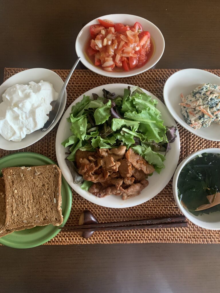 玄米雑穀ご飯が切れていたので、豚肉の残りを生姜焼きにしてパンで食べることにしました。左からいつもの焼き芋に🍠高タンパクヨーグルトをかけたもの、トマタマ酢、白和え、ベビーリーフを添えた豚モモ肉の生姜焼き、フォーシードブレッド、海藻スープ、以上です。