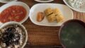 玄米雑穀ご飯が切れていたので、豚肉の残りを生姜焼きにしてパンで食べることにしました。左からいつもの焼き芋に🍠高タンパクヨーグルトをかけたもの、トマタマ酢、白和え、ベビーリーフを添えた豚モモ肉の生姜焼き、フォーシードブレッド、海藻スープ、以上です。