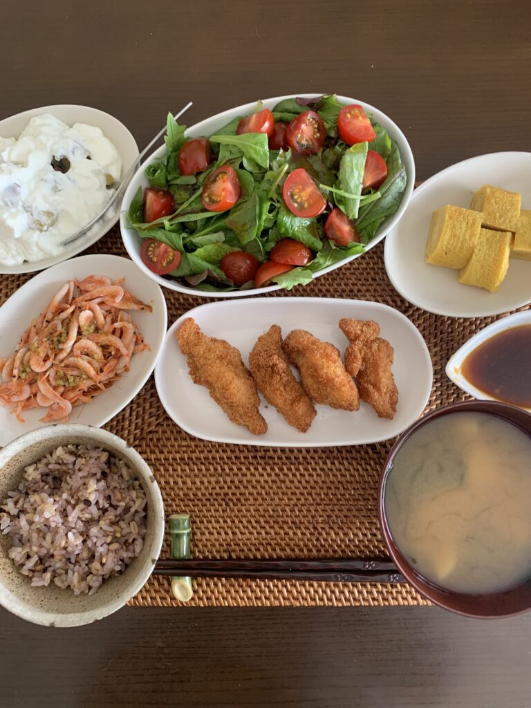 左からいつもの焼き芋に🍠高タンパクヨーグルトをかけたもの、ベビーリーフ2人分とミニトマトのサラダ、だし巻き玉子2切れ、釜揚げ桜エビにわさび醤油をかけたもの、ささみフライにおろしポン酢、スーパー大麦入り玄米雑穀ご飯、ジャガイモとワカメのお味噌汁以上です。